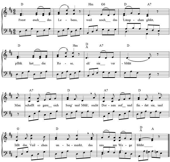 Sie ist des Lebens schönstes Band: schlagt, Brüder, traulich Hand in Hand! So wallt man froh, so wallt man leicht ins bess're Vaterland! |